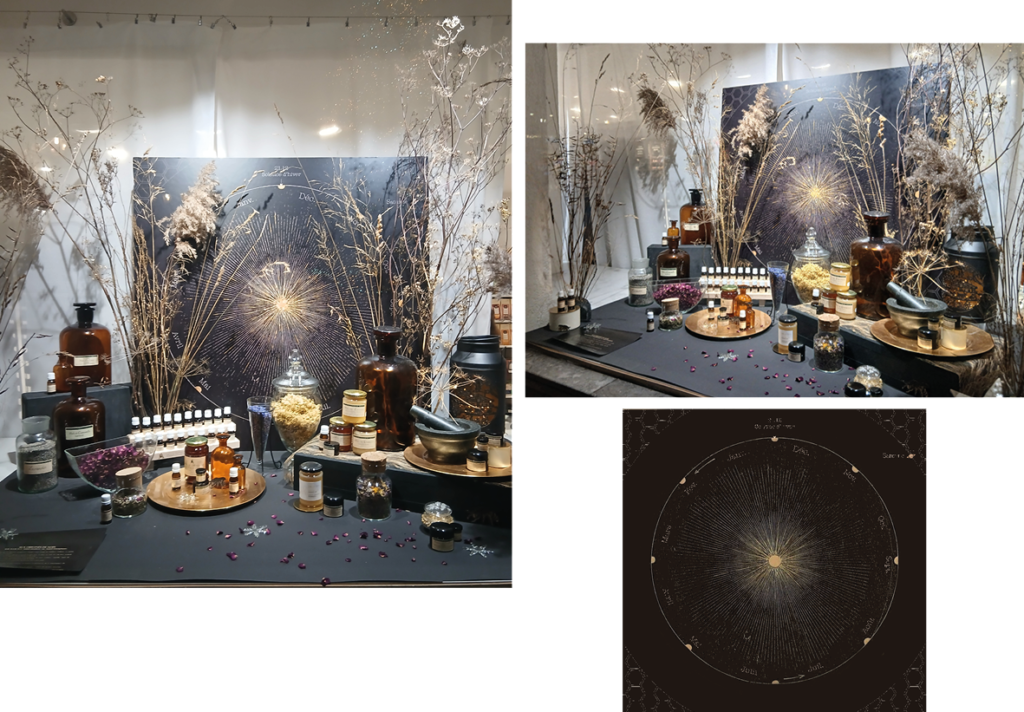Au creux de la nuit la plus longue se trouve ainsi la promesse de renaissance de l’espoir et de la lumière. Mise à l’honneur du Soleil, vainqueur face à l’obscurité. Dans une vitrine aux tonalités où le noir domine, un Soleil, illuminé de feuille d’or, occupe la place centrale qui est la sienne.